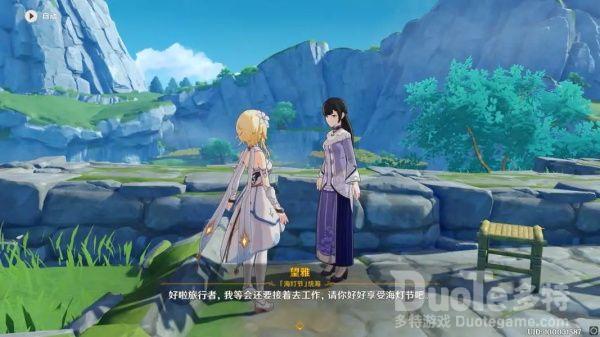 在轻策庄找到望雅后,陪同望雅散步聊天得知轻策庄多数都为老人小孩,大人们都在璃月港,而他们能做的只是让这里变得更加热闹一点。