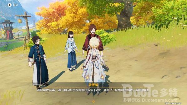 招揽无果回到店前,发现朱老板已经招揽了两个游客。旅行者帮忙制作一道「美味的珍珠翡翠白玉汤」,众人一起用餐完毕。
