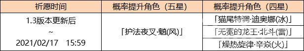活动期间,四星角色「猫尾特调·迪奥娜(冰)」「无冕的龙王·北斗(雷)」「燥热旋律·辛焱(火)」的祈愿获取概率将大幅提升!