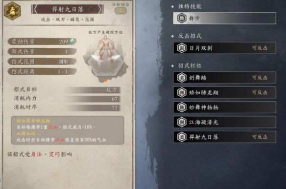 终结技是羿射九日落,也是个全身周围的范围技,这里已经可以看出设计师的用意,就是让你被一群怪围着打,你打别人也是范围伤害,别人打你,你闪避,快速给周围的怪叠流血。