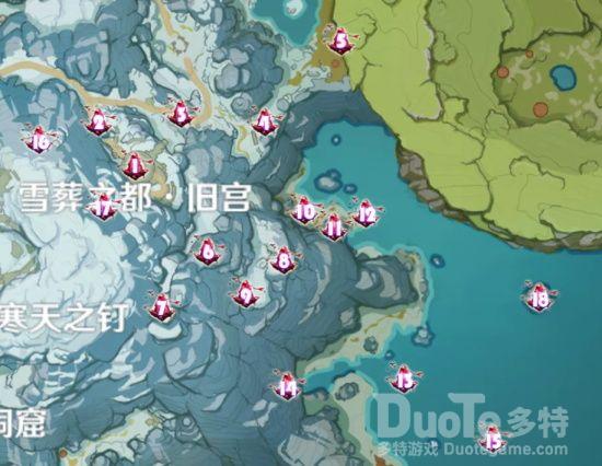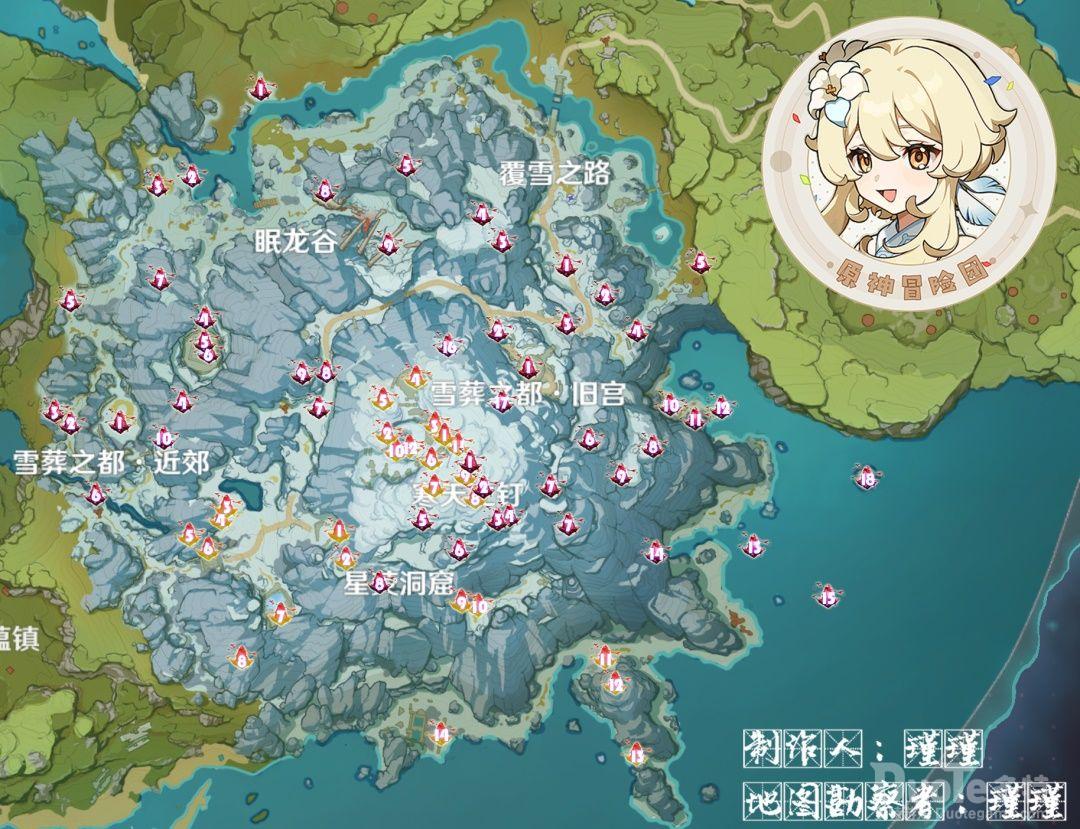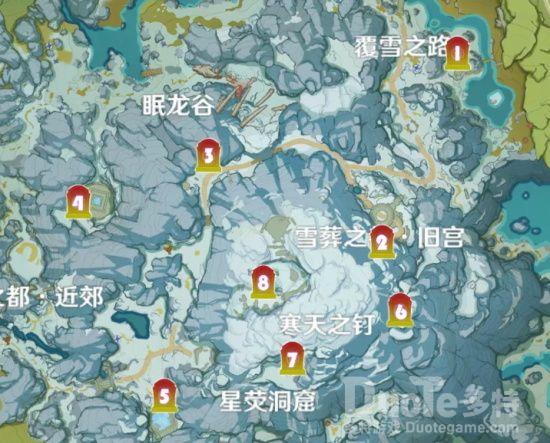 在探索版本我们会为大家带来神瞳点位详细解读以便于旅行者对神瞳的方便获取,龙脊雪山分为7个部分讲解:1.覆雪之路、2.雪葬之都·旧宫、3.眠龙谷、4.雪葬之都·近郊、5.星荧洞窟外部、6星荧洞窟内部、7寒天之钉。其中有标#为高难解密请大家看标点详细详解,建议开了山顶的传送点再进行解密。