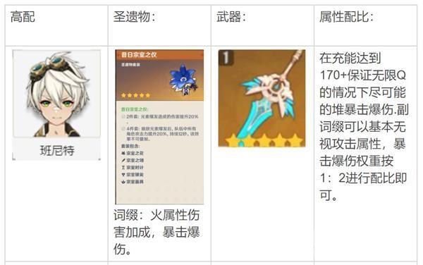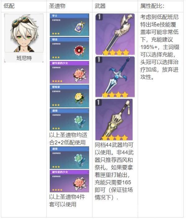 天空之刃为目前班尼特最优的选择,80级面板白值532,充能50.3%。高白值以及充能副属性完美契合班尼特,班尼特10级大招所附加攻击力为101%,80级班尼特白值为201,解锁1命后如使用宗室套轻松可以为全队增加1000+的攻击。已知班尼特2段e收益为3个火属性元素微粒.大招充能需要60能量