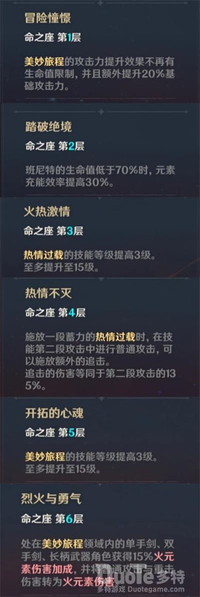 1命[冒险憧憬]:核心辅助命座,提升大招的加成效果。2命[踏破绝境]:需要生命值低于70%时触发,在实战中利用率并不大。