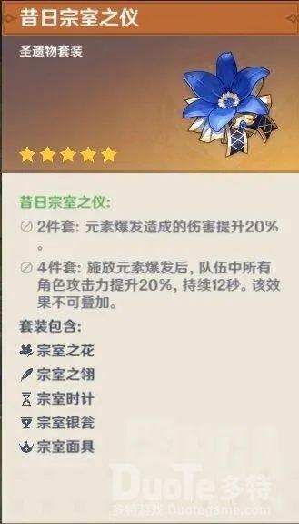圣遗物推荐环节推荐携带宗室套四件套,词缀选择火属性伤害加成,暴击爆伤,副词缀优先暴击爆伤。