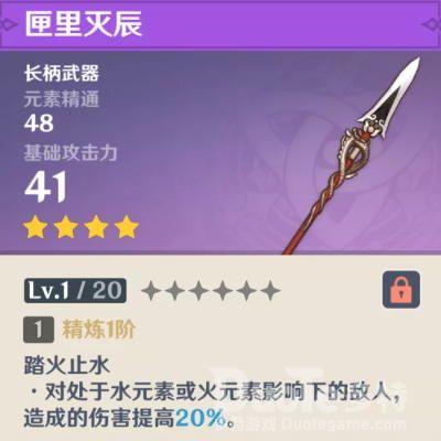 副属性为元素精通的长柄武器,是比较贴切香菱的武器之一,不过香菱在12层往往是打融化居多,很容易出现无法触发武器技能的情况,导致如果想打反应容易吃不到武器技能的加伤,确保武器技能的加伤又浪费了元素精通的加成,在目前的环境里比较尬尴,有五星武器的情况下不推荐练,可以过渡使用。