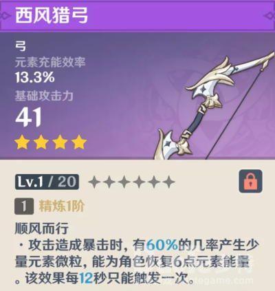 副属性为元素充能效率的弓、副词条与上面法器一样要攻击暴击时才能恢复元素微粒,因为等级达就会送所以抽取意义就变低了,对于0氪低氪金拥有温蒂角色的玩家一个福音。当然了对于辅助温迪的玩家来说没有天空之翼&阿莫斯之弓,西风猎弓是不错的选择。