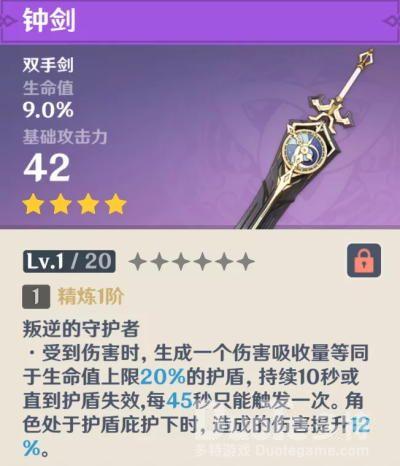 副属性为生命值百分比的双手剑、比较适合角色个人认为目前没有,因为副属性的尴尬处境又双手剑角色攻击防御成长均较高的情况下,生命确实不吃香。另附带效果45秒触发一次,角色身上有盾的情况满精也就只加24%伤害,确实比较尴尬,不建议抽取。