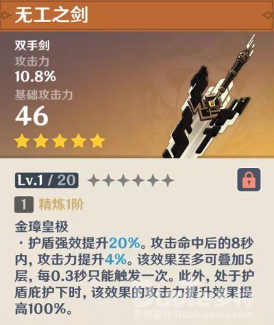 副属性为攻击百分比的双手剑,武器词条为护盾加成以及站场攻击百分比加成。与狼的末路最大的区别是武器技能,无工之剑在有护盾的情况下加成比较稳定。双手剑角色目前表现都比较强势(优秀的属性成长),已经入手狼的末路的小伙伴可以先不抽。如果没有抽到狼的末路、天空之傲的可以入手一把。