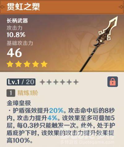 副属性为攻击百分比的长柄武器,武器词条为护盾加成以及站场攻击百分比加成。看技能就知道比较适合钟离,但对于目前版本而言长柄武器的毕业武器还是和璞鸢。没有抽到天空之脊、和璞鸢的可以考虑入手一把,不建议抽满精炼,意义较小。