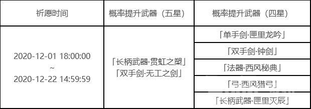 活动期间内,四星武器「单手剑·匣里龙吟」「双手剑·钟剑」「法器·西风秘典」「弓·西风猎弓」「长柄武器·匣里灭辰」的祈愿获取概率将大幅提升!
