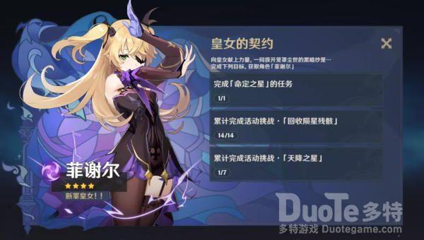 未归的熄星活动界面右下角次界面皇女的契约可以看到领取菲谢尔的条件,前面一直参与的话现在只要再刷7次三阶段挑战就能获得菲谢尔啦。