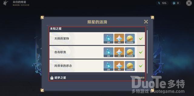 在陨星的涟漪中一共有三个阶段的任务,每个阶段又有三个小任务,完成未知之星和诡梦之星的任务一共可以获得120个熄星能量,完成命定之星任务一共可以获得60个熄星精髓。