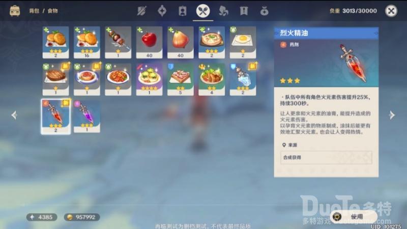 开场记得使用烈火精油,提升火元素角色伤害,并保持这个buff。