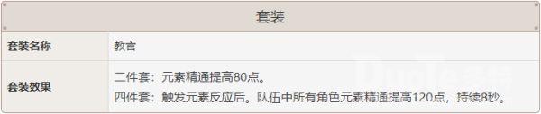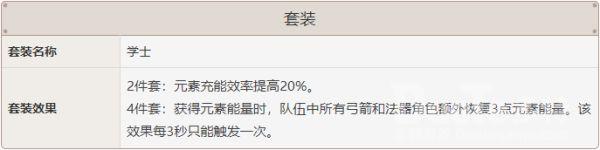 圣遗物选择方面,我推荐前期选择教官4、流放者2+学士2这两种搭配,前者可以提高全队的元素精通,后者可以有效提高元素充能效率,减少元素爆发空档期。