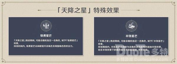 「天降之星」挑战期间,可能会不定期随机赋予一个角色特殊效果,特殊效果分为「骁勇星芒」与「丰饶星芒」。