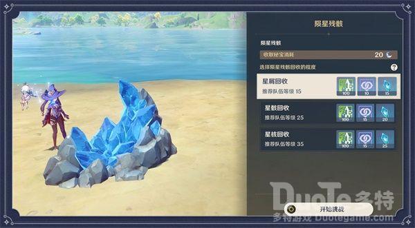 在倒计时时限内成功即可完成挑战,消耗20原粹树脂回收陨星残骸可获得「熄星能量」与角色好感经验。累计回收一定数量的陨星残骸可以在活动界面领取额外奖励。