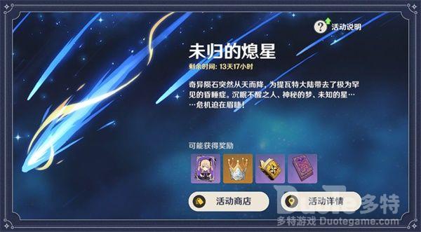 解锁「未归的熄星」每个阶段活动时,会同时解锁三个「陨星的涟漪」世界任务。在活动期间,完成这些世界任务可以获得「熄星能量」、「熄星精粹」、原石、摩拉奖励。