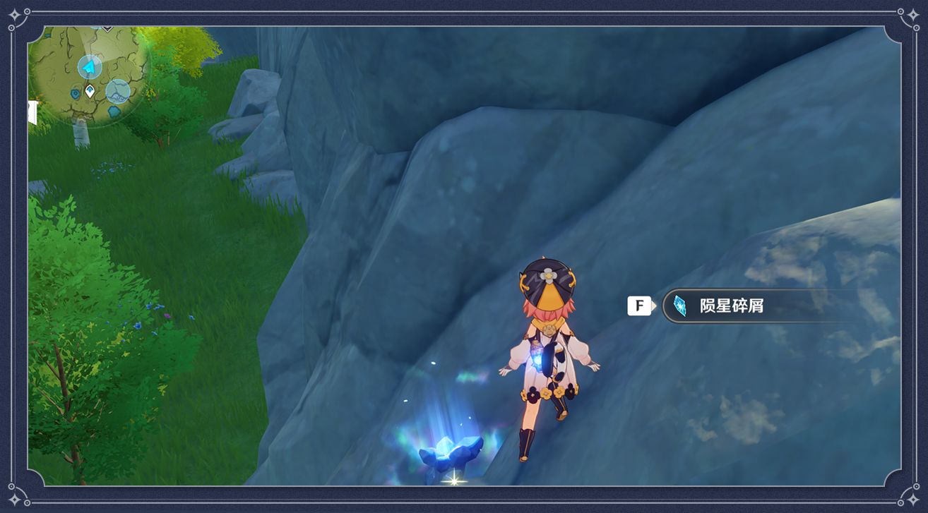 抵达受灾区域后,可以在左上角小地图上定位陨星碎屑的大致位置。角色接近碎屑时,神之眼会与之发生共鸣发出光芒,与碎屑距离越近光芒越强烈。
