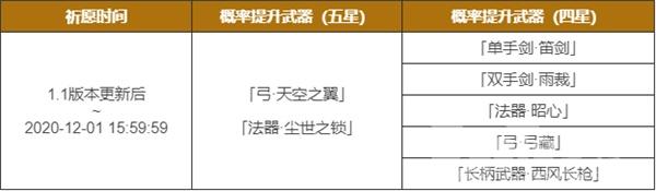 活动期间内,四星武器「单手剑·笛剑」「双手剑·雨裁」「法器·昭心」「弓·弓藏」「长柄武器·西风长枪」的祈愿获取概率将大幅提升!