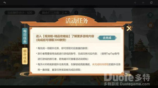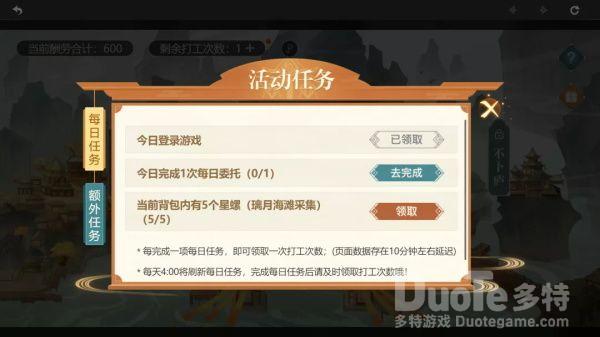 在活动界面的上方点击“剩余打工次数”可进入活动任务界面,完成每日任务可获得额外打工次数,3个每日任务+1次赠送的次数,每天可有4次打工次数。