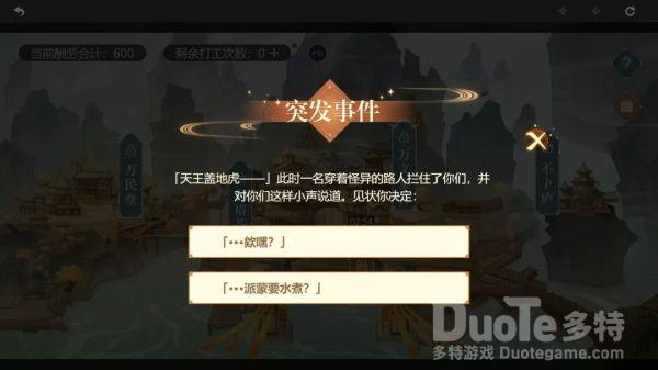 3、每次开始打工后均有可能会遇见突发事件,玩家在选择选项完成事件后会得到额外酬劳,不同的选项会触发不同的剧情。