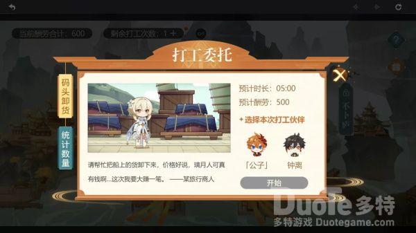 2、进入打工委托界面,任选1项委托并选择公子或者钟离作为打工伙伴即可开始打工。每次打工在等待一定时间后可获得相应的酬劳,同一地点2种委托的酬劳数目相同,酬劳数目随打工地点的开放而上升。