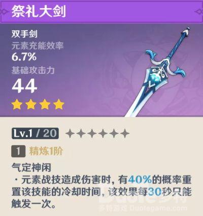 副属性为元素充能的大剑,武器词条和同系列的祭礼剑相同,重云使用时可以将空档期大大缩减,北斗使用也能有不错的表现。