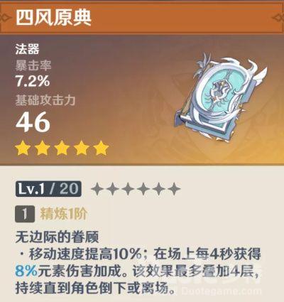 副属性为暴击率的法器,武器词条通过持续站场可以增加元素伤害加成,非常适合站场的主C法器角色使用,当前版本凝光,丽莎等站场法师的毕业武器。可莉目前有站场流和速切流两种用法,站场流的可莉自然是十分契合四风原典的,速切流的可莉同样也能使用,虽然不能完全吃到四风原典的武器效果,但5星武器自带的面板无疑还是大大优于4星武器的,而且还是可莉最需要的暴击率。有意向培养为站场法师的也可以考虑携带。缺点为切换角色或死亡后buff将会消失。组队时无需更换角色所以非常好用,而且加移速能跑的更快(方便下次活动抢元素凝块)。