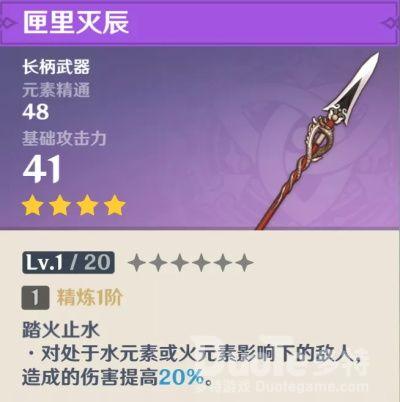 副属性为元素精通的法器,武器词条为攻击受到火,水元素影响的敌人时,伤害会大幅度提升。反应流香菱对冰,水史莱姆宝具,但生效条件限制较多,与其他长柄武器相比并不出彩,实战中目前唯一的长柄武器角色香菱并不会使用这把武器。
