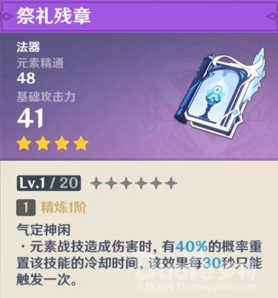 副属性为元素精通的法器,武器词条和等同于上面俩把武器,砂糖需要堆元素精通用来辅助时可以携带,其他法师辅助时可以考虑直接携带讨龙英杰谭。