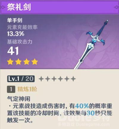 副属性为元素充能效率的单手剑,武器词条在元素战技造成伤害时,有一定几率能重置该技能的冷却时间,当前版本七七毕业武器,在满精炼时能使七七的元素战技一直释放,副属性提供的元素充能更是可以加快七七元素爆发的充能速度,同样也是副C行秋的毕业武器,不给这把武器提升等级的情况下,可以给班尼特等破盾工具人在深渊使用,效果相当不错。