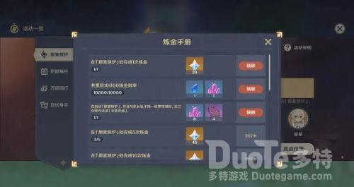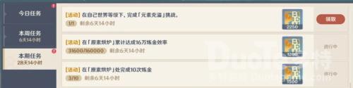 活动任务合计奖励:300原石,6蓝书,10紫书,23魔矿,6断片,100000摩拉。而且在纪行系统里新增了和元素烘炉有关的三个任务,其中元素充溢指的是三分钟内完成,三个任务完成能提升4950纪行经验,差不多相当于5级纪行等级,如果想要追赶纪行等级进度一定不要错过。
