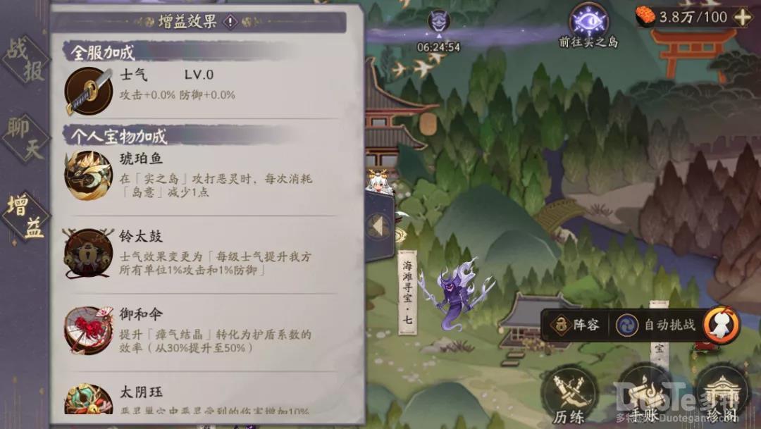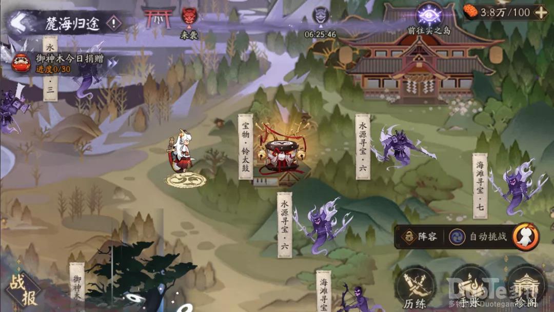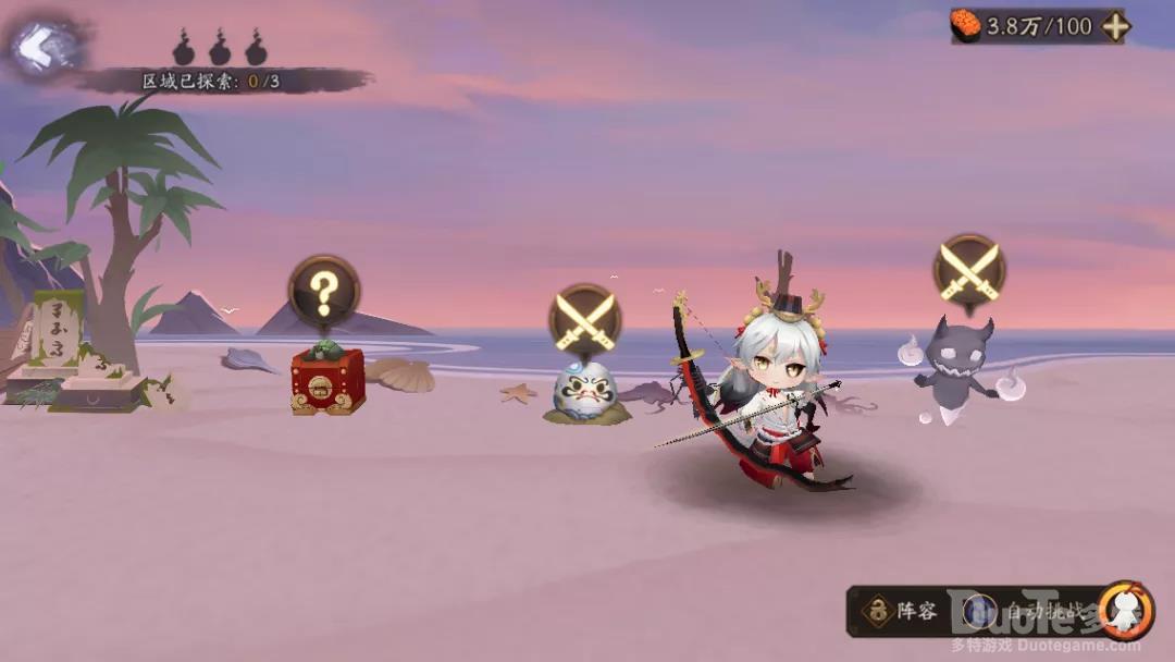 地图共分为四个大区域每个区域都埋藏着一件宝物,玩家们可通过探索获取宝物激活宝物效果,让铃鹿御前更强大