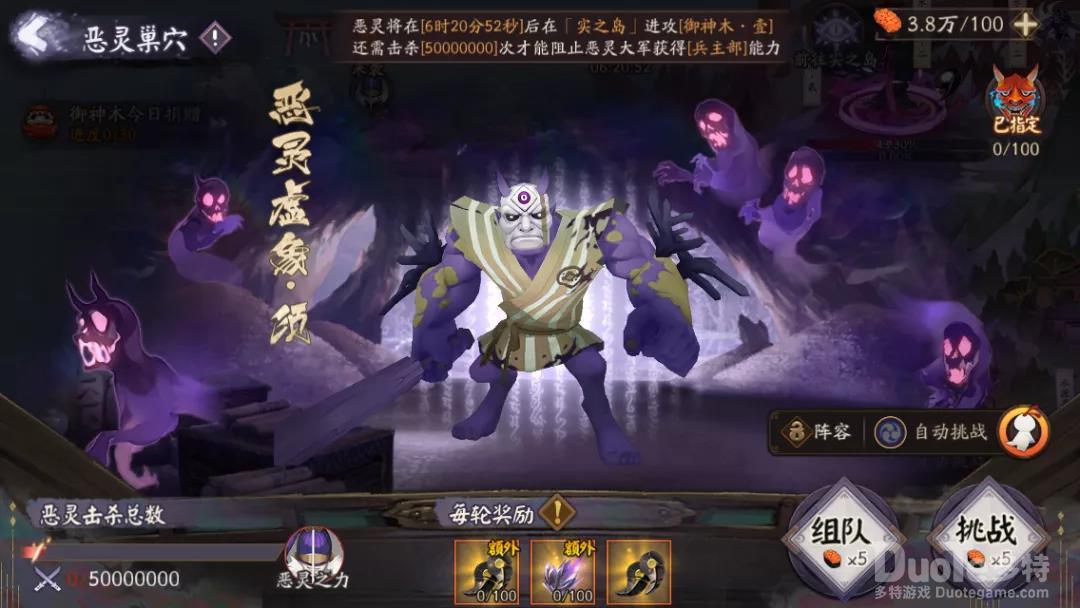 地图中还遍布多个恶灵巢穴数量随天数递增,每个恶灵巢穴每天重置1次恶灵之力且虚之屿恶灵不会离开巢穴攻击御神木,大人们需合力剿灭虚之屿的恶灵巢穴,当击杀恶灵数到达指定值时恶灵将失去该恶灵之力,且全服累计的士气值+1级。