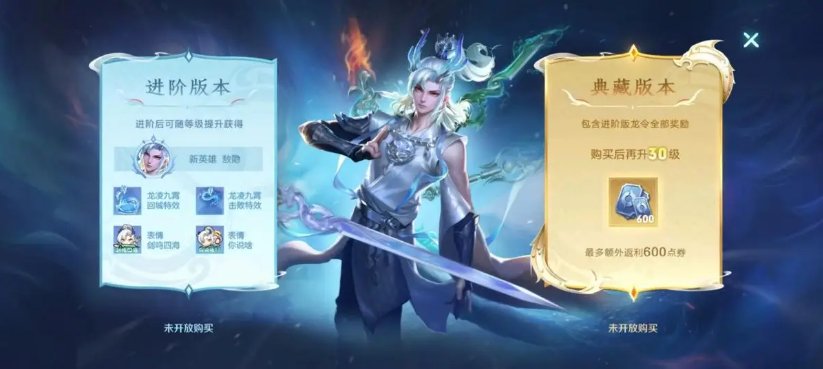 进阶龙令:等级上限为30,激活后提升龙令等级可同时获得普通版及进阶版奖励,其中进阶龙令30级奖励为新英雄敖隐。