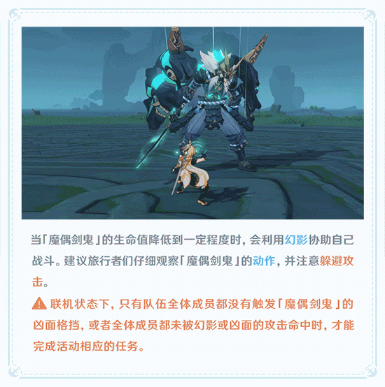 A联机状态下,只有队伍全体成员都没有触发「魔偶剑鬼」的凶面格挡,或者全体成员都未被幻影或凶面的攻击命中时,才能完成活动相应的任务。