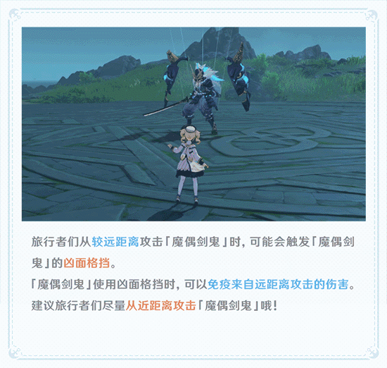 旅行者们从较远距离攻击「魔偶剑鬼」时,可能会触发「魔偶剑鬼」的凶面格挡。「魔偶剑鬼」使用凶面格挡时,可以免疫来自远距离攻击的伤害。建议旅行者们尽量从近距离攻击「魔偶剑鬼」哦!