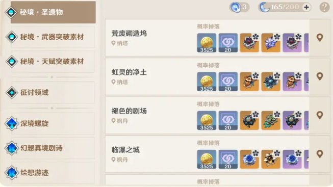 冒险之证秘境界面展示优化,根据养成材料的种类进行分类,方便寻找,同时秘境将按照区域开放时间从新到旧的顺序进行排序,方便更快找到所需要的掉落信息。