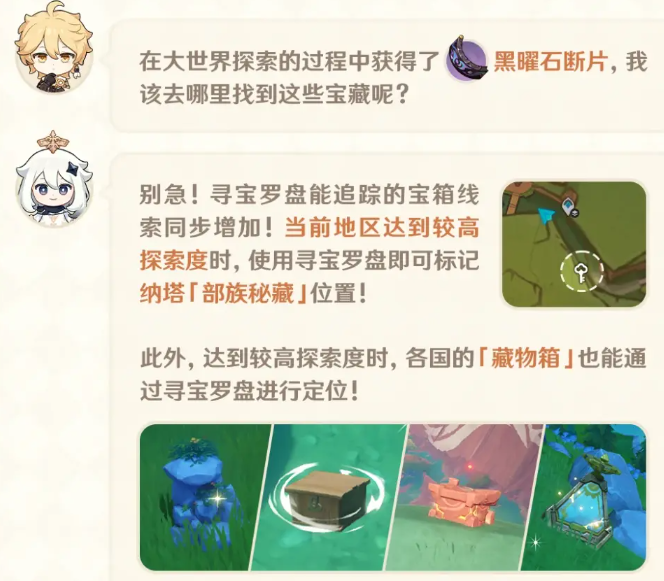 首先是寻宝罗盘,追加了自动寻路纳塔勇士挑战,可定位更多宝箱地点,当前地区达到较高探索度的时候,使用罗盘可标记纳塔部族秘藏的位置。