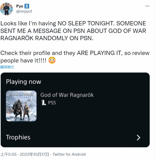“mrpyo1”发文表示:今晚是个不眠夜了,有人在PSN上给我发了一条关于《战神:诸神黄昏》的信息。检查了他们的个人资料发现他们正在游玩,看来评测人员已经获得他了!
