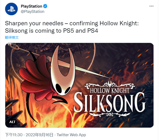 PlayStation官方确认,《空洞骑士:丝之歌》将会登陆PS5和PS4平台。