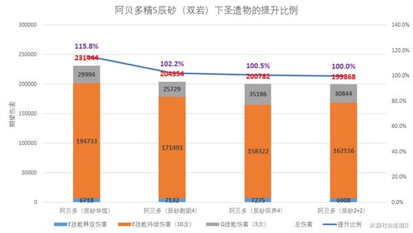 阿贝多这边我也是来凑个数,阿贝多因为有专属4星武器辰砂剑的原因,防御的收益会比较高,再加上本身E技能的伤害占比就非常大,所以导致了其他圣遗物在阿贝多面前基本都不如华馆。而回声4的提升主要是在大招伤害上,这个提升还是很明显的,但是如果不是2命大招流的阿贝多的话,还是没有必要用回声4的。