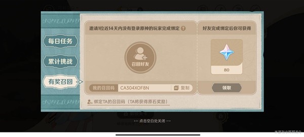 邀请回流好友,好友通过你的召回码绑定即可获得80原石,注意14天的条件