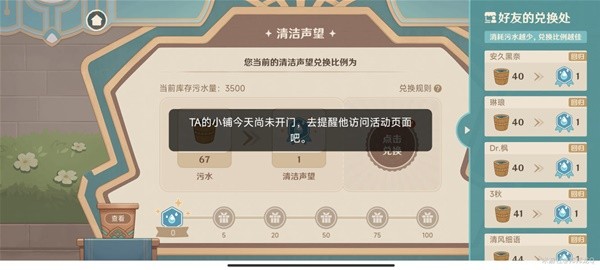 在声望商店这里,我们每天都兑换比例是不同的(污水就是每个关卡给的,而清洁声望即可解锁里程碑解锁奖励),点击页面右方箭头打开好友列表,找汇率合适的好友可以帮助我们更好的解锁里程碑奖励哦。