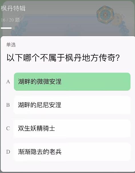 16、以下哪个不属于枫丹地方传奇? 答:A、湖畔的微微安涅