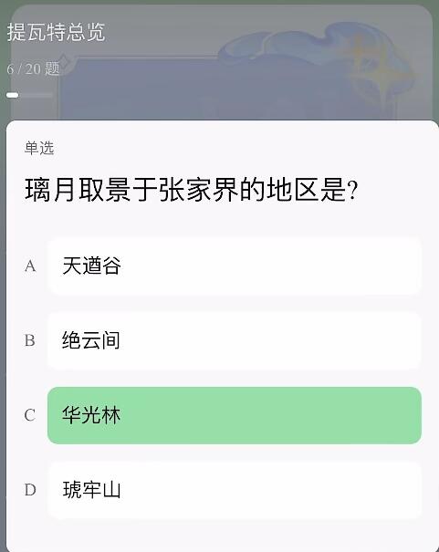 6、璃月取景于张家界的地区是? 答:C、华光林