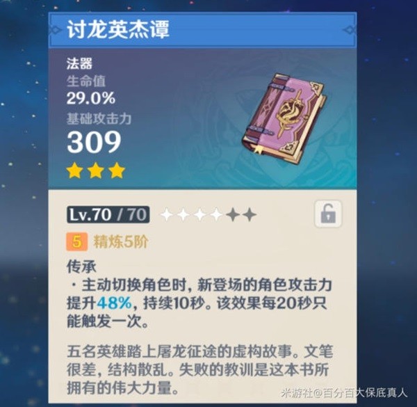这把武器是三星武器里最强武器之一,而且使用率远远超过部分四星甚至五星武器。它最大特点是给下一位登场角色增加48%攻击力。