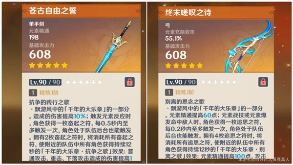 该系列武器是“五星辅助武器”,专门为五星辅助角色打造,数值自然也会给的大方一些。比如温迪使用终叹之诗就同时具备了聚怪和加精通(固定100点)的能力。