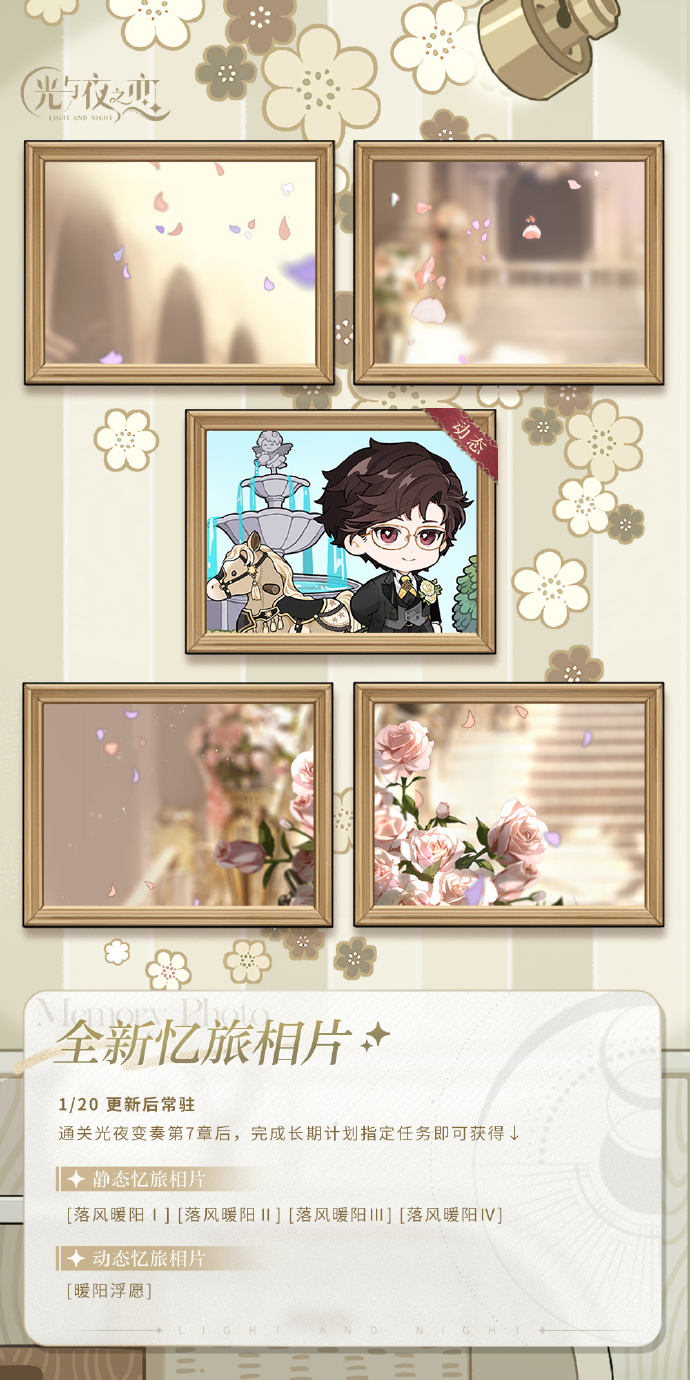 陆沉生日系列活动期间,可限时获取[逐光忆旅・自选组合](合计4个),打开后可在以下4组动态忆旅相片中【自选一组】