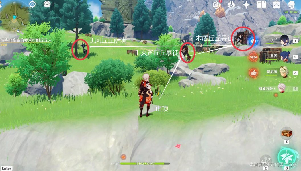击杀顺序:火斧丘丘暴徒>木盾丘丘暴徒>风丘丘萨满。